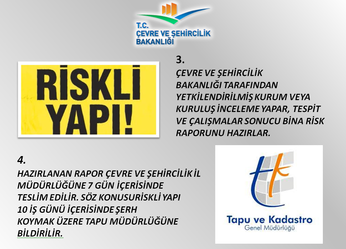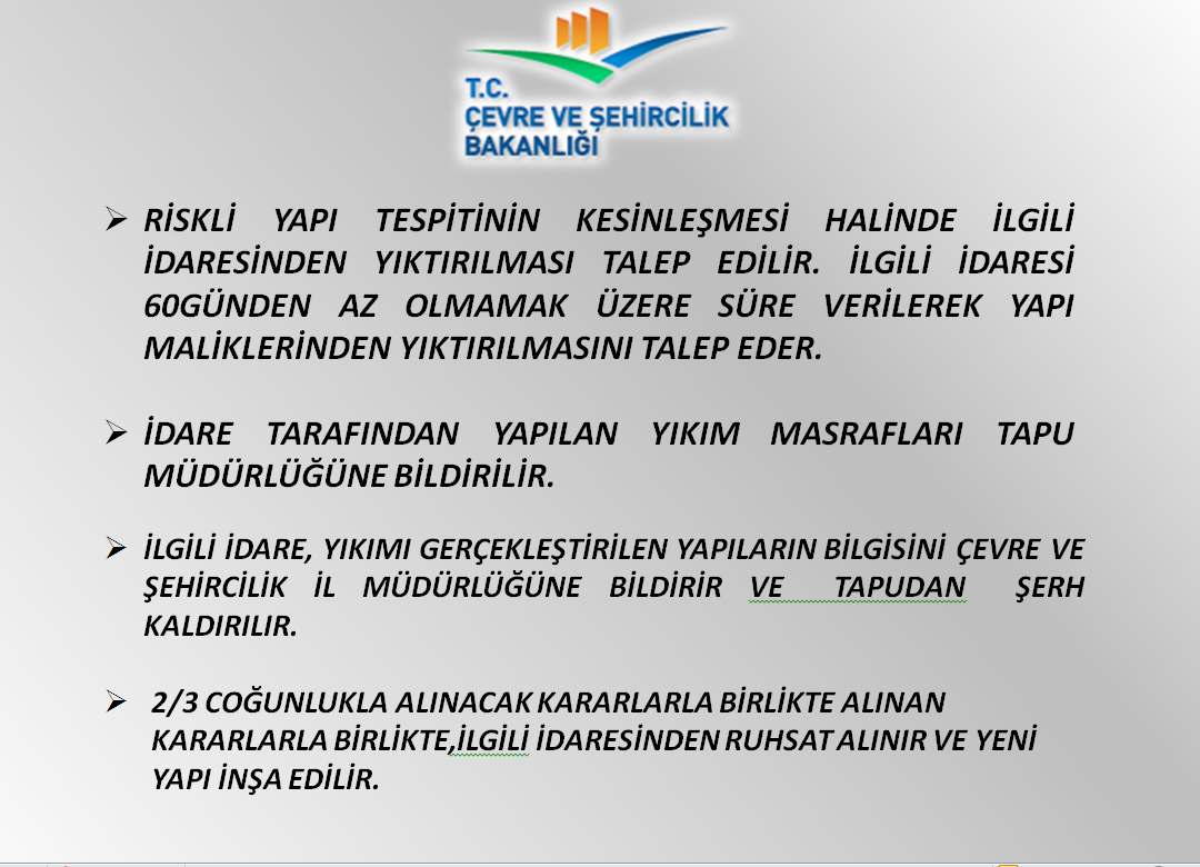 Riskli Alanlardaki Yapılar için Kentsel Dönüşümde yapılacak işlemlerle ilgili izlenecek yol haritası şöyledir.